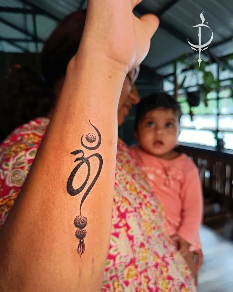 This forearm tattoo artistically extends the Om symbol into flowing curves that merge into rudraksha beads. The design is spiritual and feminine, representing meditation, prayer, and inner calmness. Its long and slender style creates a graceful look that flows naturally along the arm.