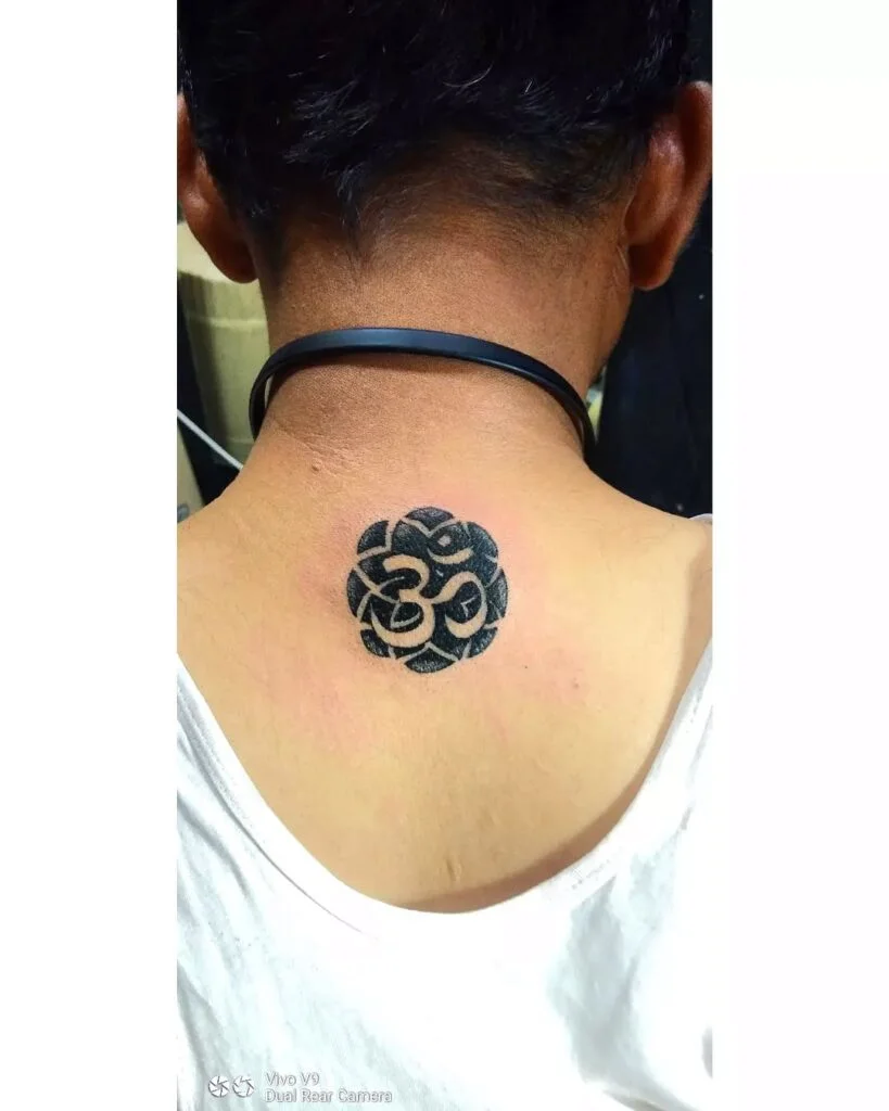 Simple yet meaningful, this tattoo features a small Om inked just below the hairline at the back of the neck. The placement makes it subtle but deeply personal, visible when chosen and easily hidden otherwise. The neat black lines highlight purity and elegance.