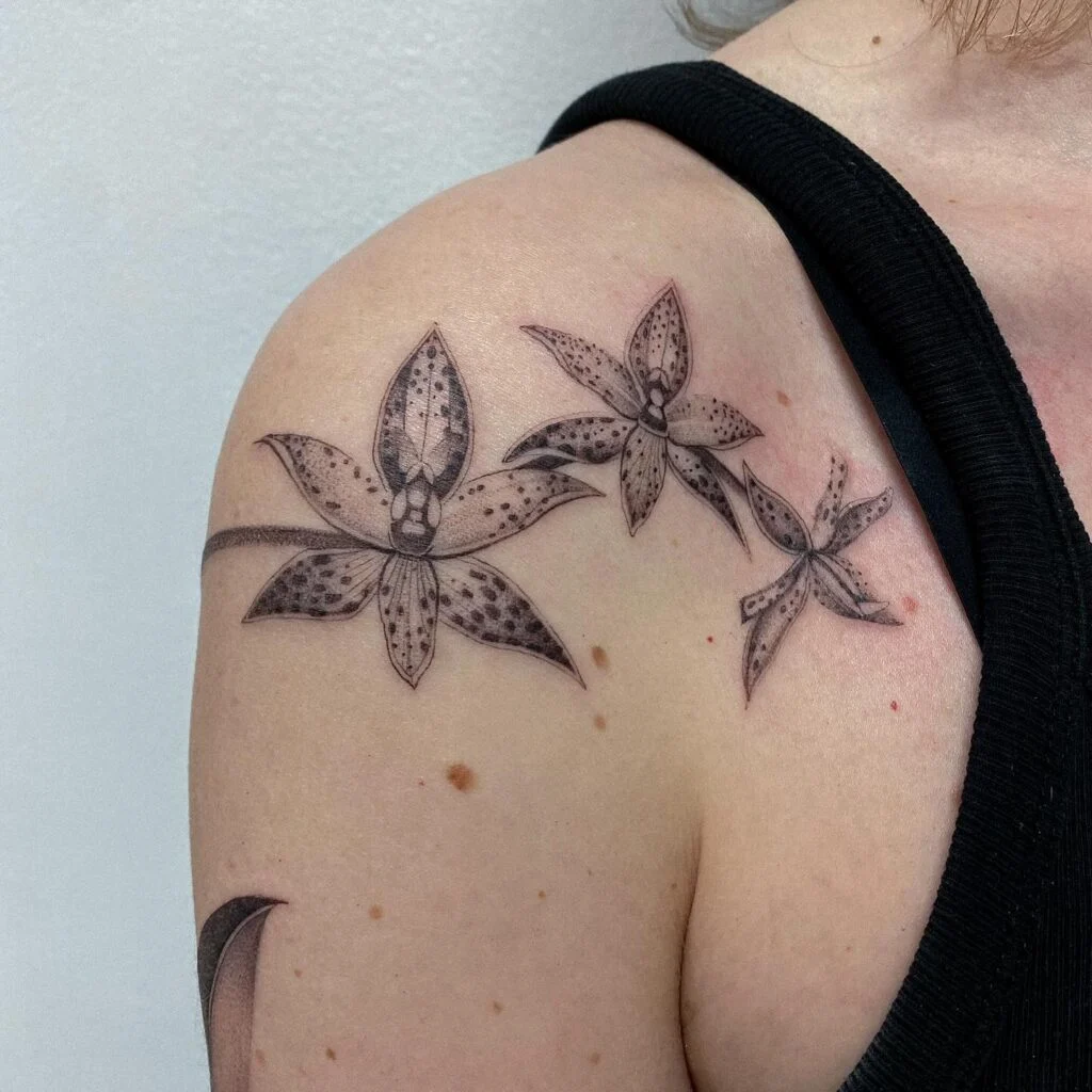This shoulder tattoo showcases a trio of orchids created with fine dotwork shading, giving the flowers a soft, almost ethereal appearance. The use of dotted textures brings subtle depth to each petal, allowing the orchids to stand out gracefully on the skin without appearing too heavy.