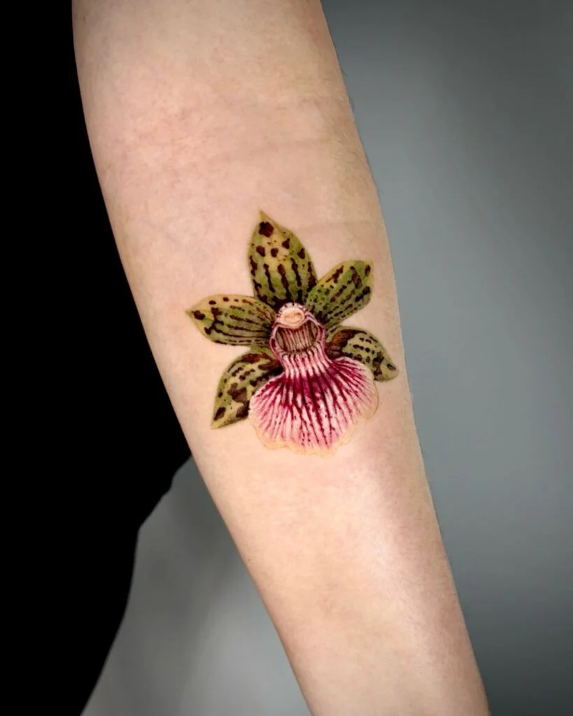 This vibrant forearm tattoo features a highly realistic orchid design with shades of green, pink, and burgundy. The detailed texture of the petals, combined with the lifelike color blending, gives the flower a three-dimensional appearance that almost feels alive.