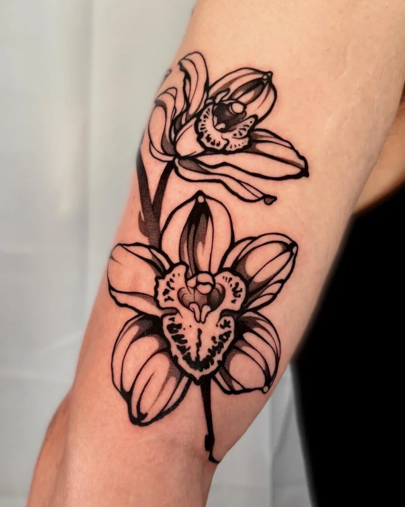 This striking tattoo features two bold orchid blossoms outlined in deep black ink, with fine details that highlight the flower’s natural beauty. The strong contrast between the dark shading and the lighter spaces within the petals creates a sense of dimension and strength, making it a captivating design for women seeking an elegant yet powerful symbol.