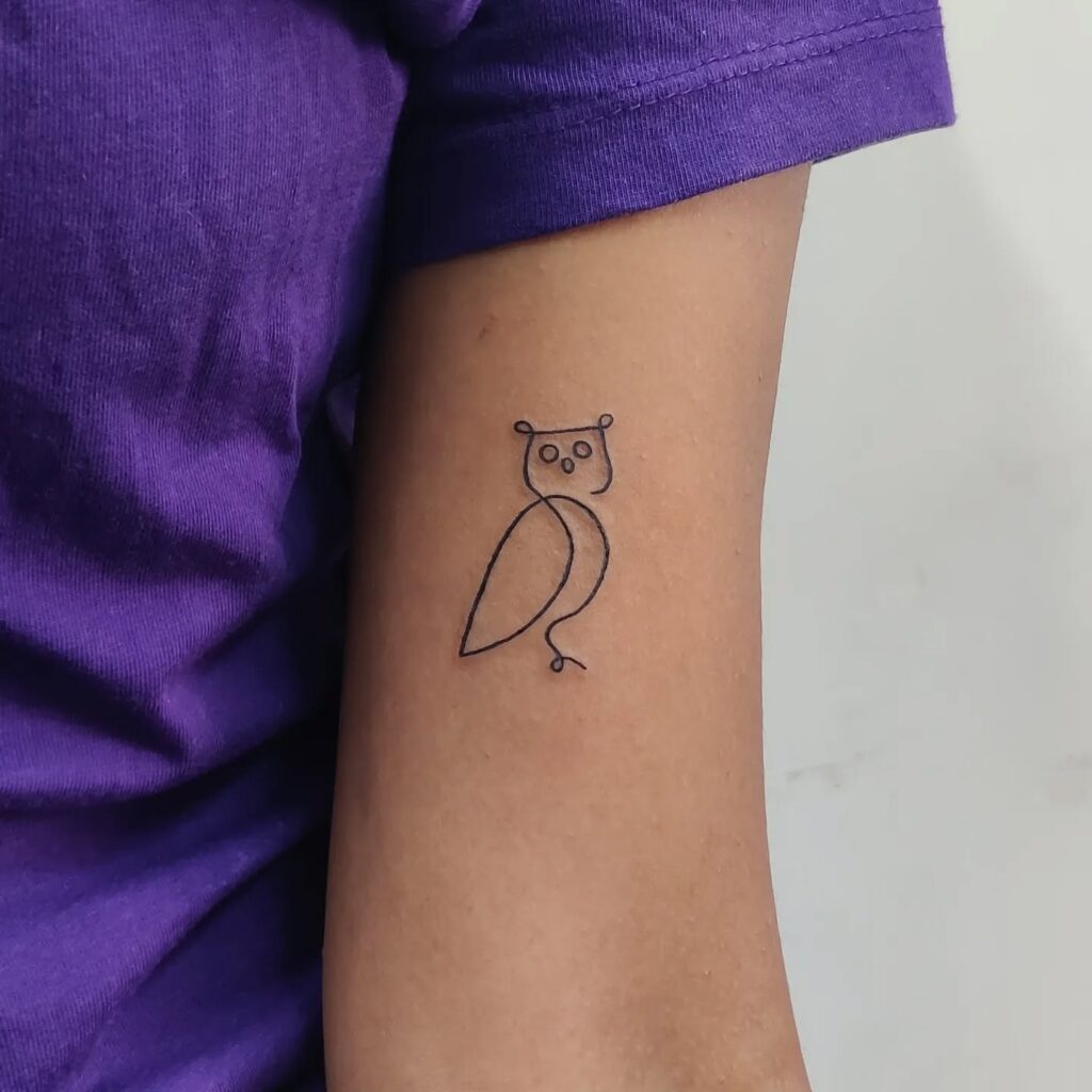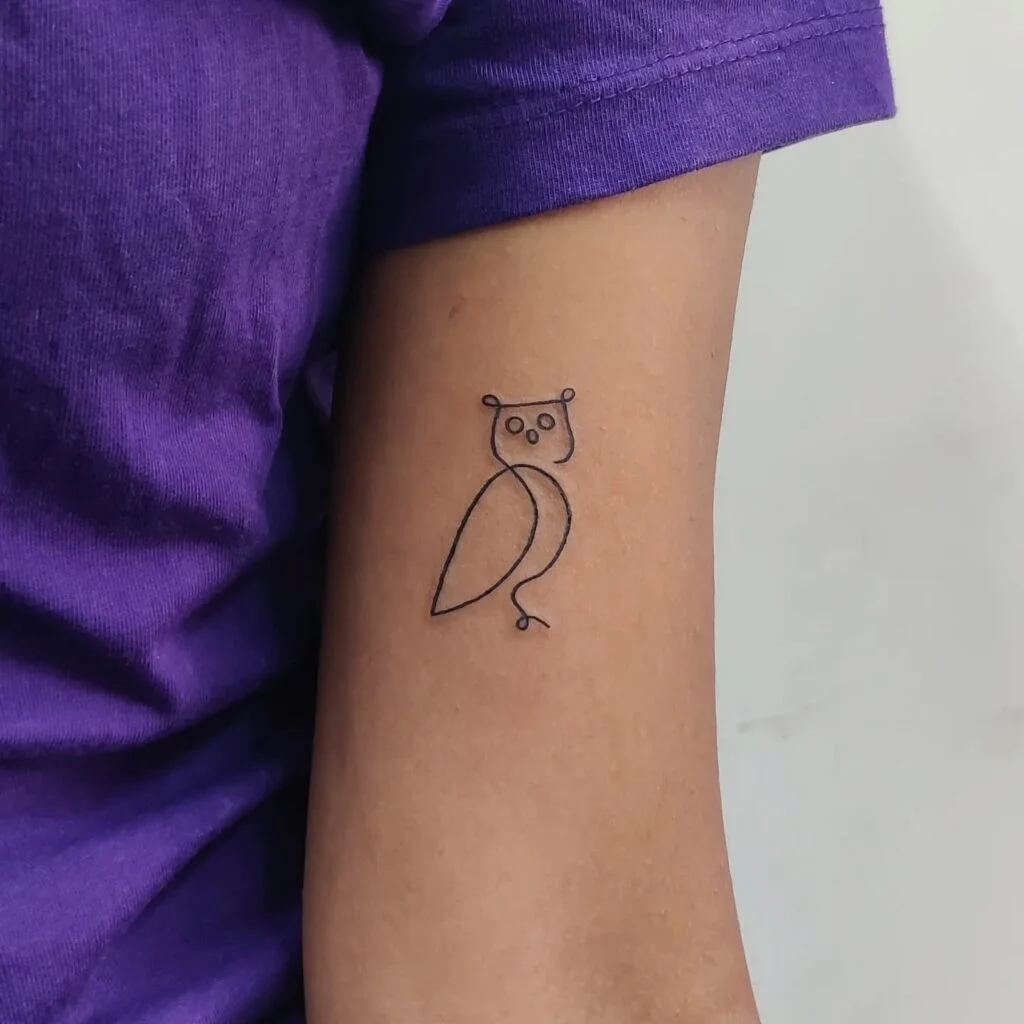 This creative tattoo uses a single continuous line to form an abstract owl silhouette, making it unique and artsy. The minimalist style gives it a modern and chic vibe, while still being recognizable as an owl.