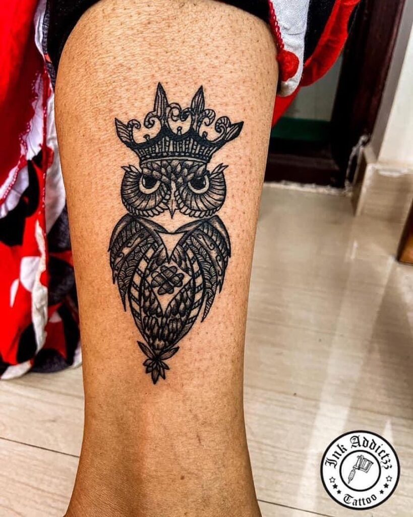 This tattoo shows a majestic owl wearing a crown, its feathers drawn in a tribal-like, ornamental style. The blackwork detailing creates depth and gives the design a fierce, royal presence.