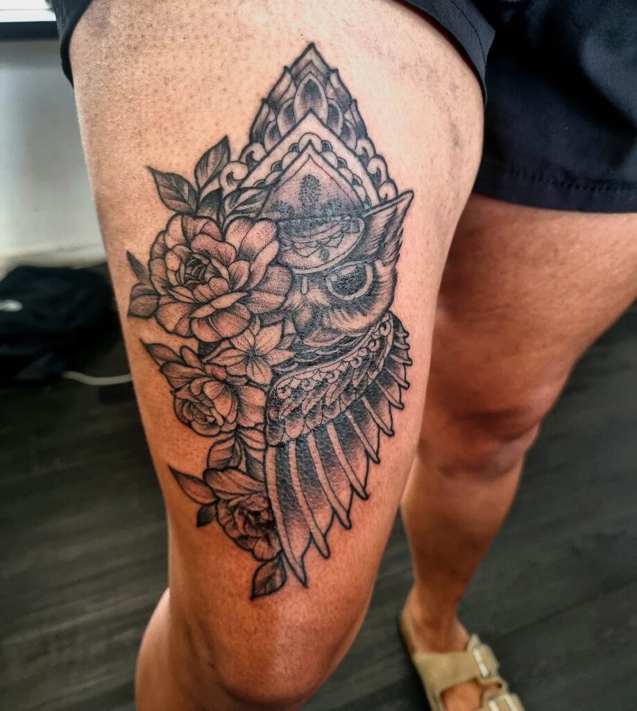 This striking piece shows a powerful owl mid-flight, wings spread wide and talons extended. The bold shading and detailed feathers create a sense of movement and strength, making it an eye-catching thigh piece.