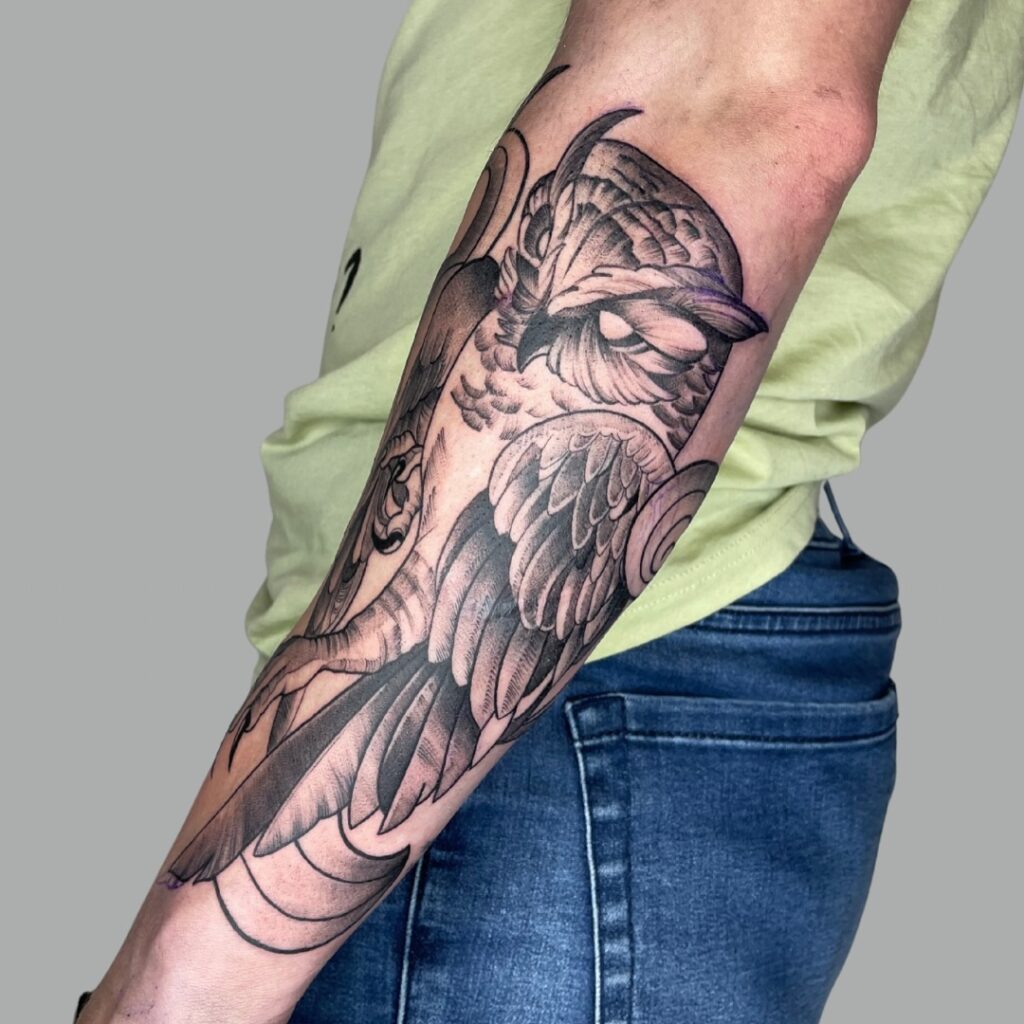 This bold forearm piece features a highly detailed owl with extended wings, showcasing precise linework and shading. The flow of the feathers follows the arm’s shape, giving it a dynamic and harmonious look.