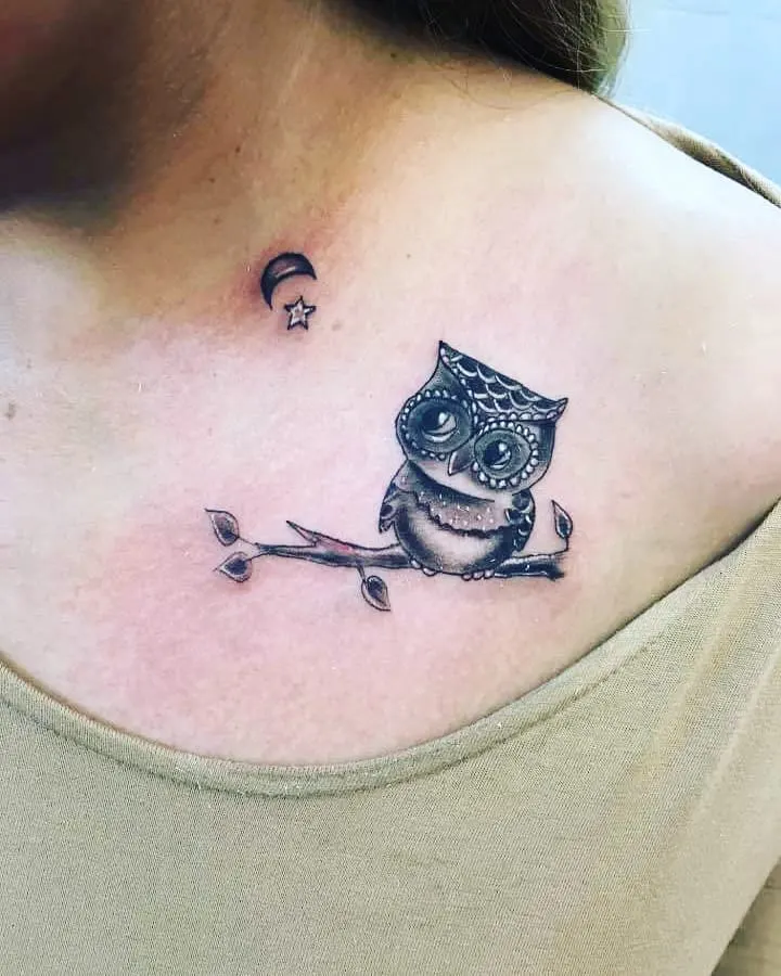 This charming tattoo features a cartoon-like owl perched on a branch, paired with a tiny crescent moon and star. Its big eyes and playful expression make it adorable and whimsical.