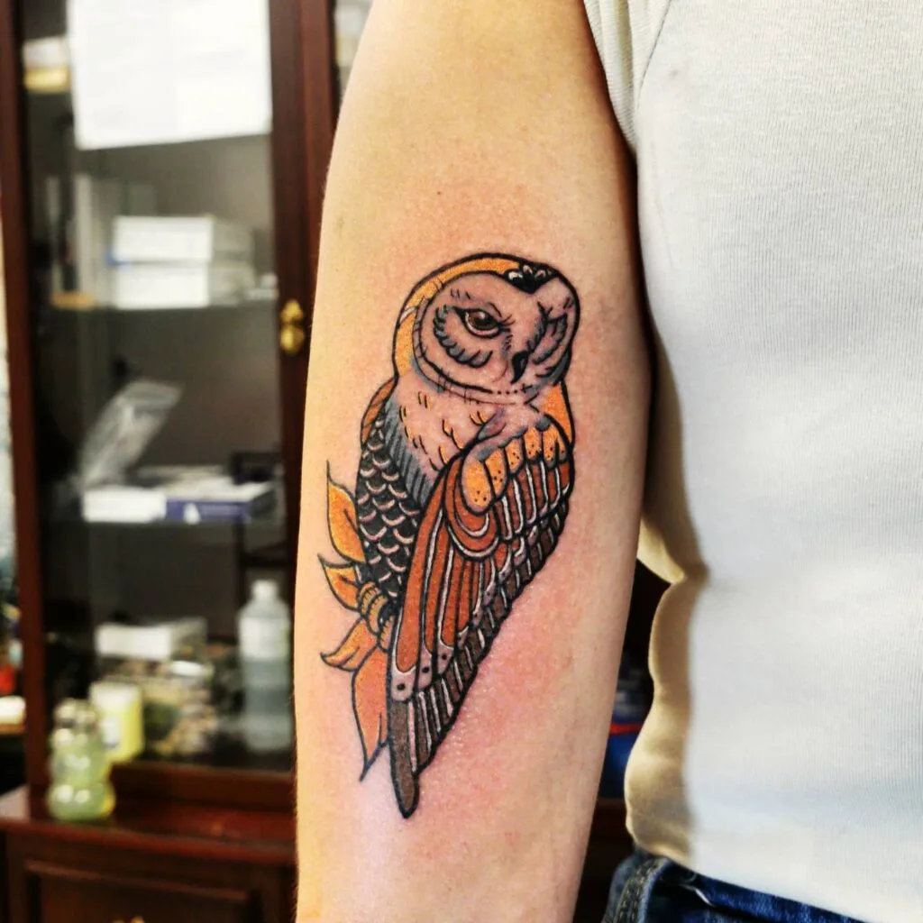 This tattoo features a striking barn owl with beautifully detailed wings, creating an elegant and powerful look. The owl’s feathers are shaded with precision, and warm orange tones give the piece a lively and unique style. Placed on the upper arm, it feels like a protective guardian watching over the wearer.
