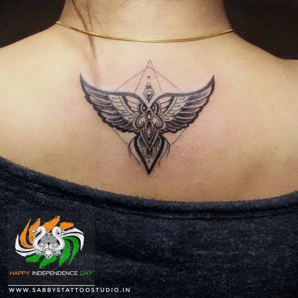 This tattoo shows a stylized owl with wings spread inside a diamond-shaped frame, perfectly centered on the upper back. The symmetrical design and fine line details give it a modern, geometric feel. The placement makes it elegant yet bold, a design that feels both decorative and symbolic.