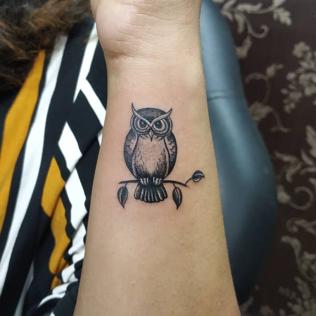 This small yet detailed tattoo depicts a perched owl sitting on a delicate branch, making it ideal for the wrist. The clean black ink lines and subtle shading give it a soft, elegant appearance while keeping it minimalistic and cute.