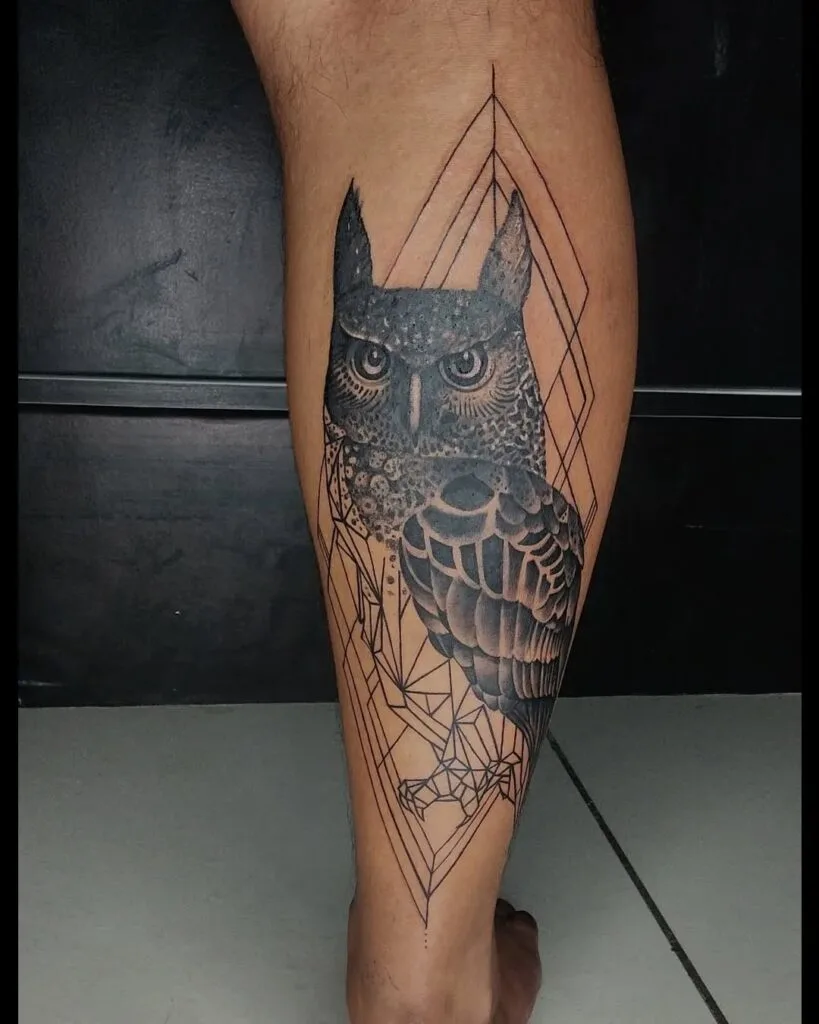 Placed on the calf, this tattoo elongates the leg and creates a strong visual impact. It’s a perfect design for those who admire the owl’s symbolism of wisdom and mystery, with the geometric lines representing balance, stability, and clarity of mind.
