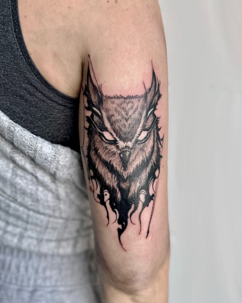 This tattoo features an intense, shadowy owl face with pointed feathers and glowing eyes, giving it a dramatic, mysterious vibe. The background blends into inky, flame-like shapes, adding depth and movement to the piece.