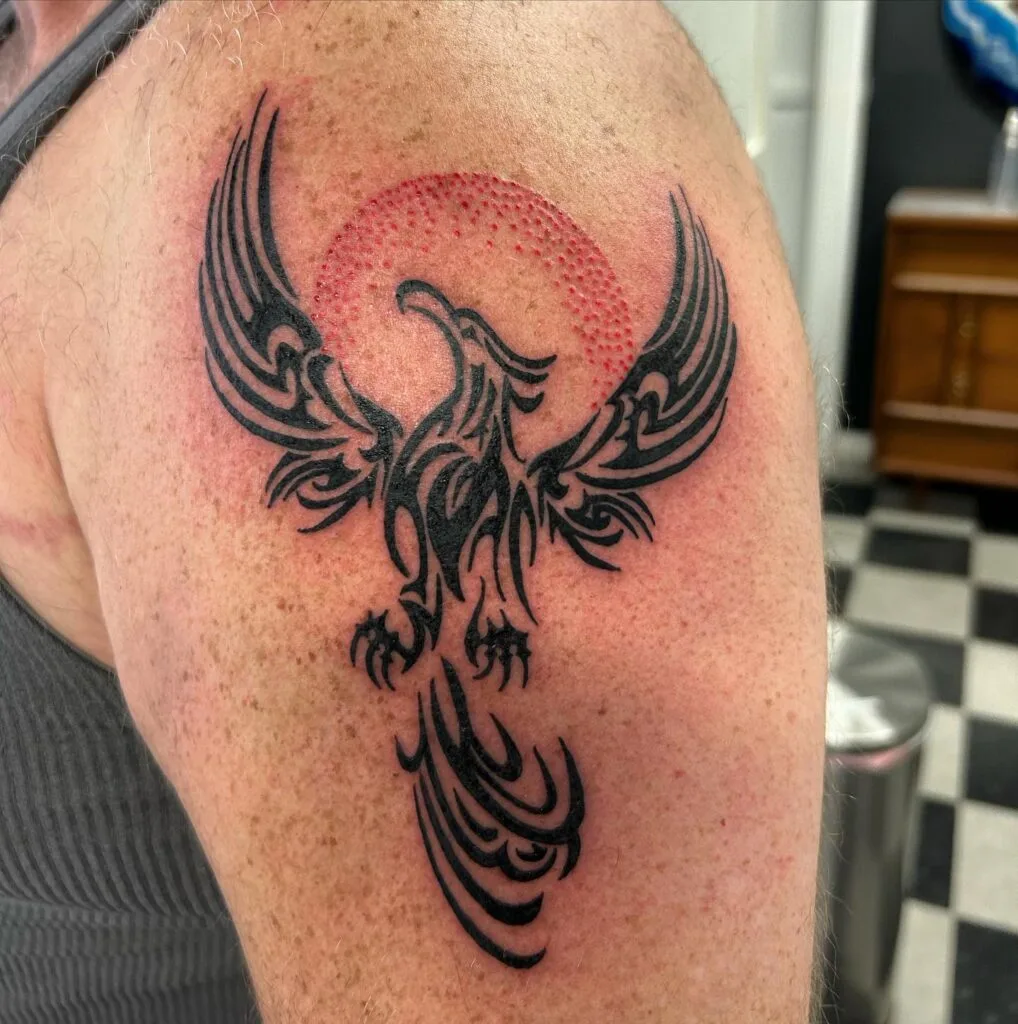 This tattoo features a bold tribal-style phoenix with outstretched wings, perfectly framed by a red dotwork sun halo. The black ink design emphasizes symmetry, sharp lines, and the mythic power of rebirth, giving it a fierce and timeless look.