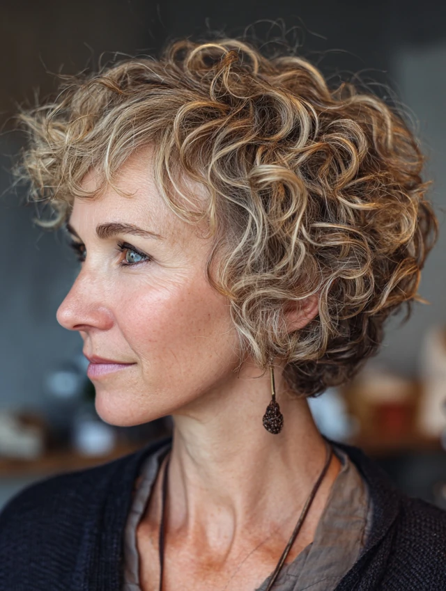 A curly pixie bob enhances natural texture while keeping the shape controlled. The curls add body and movement.