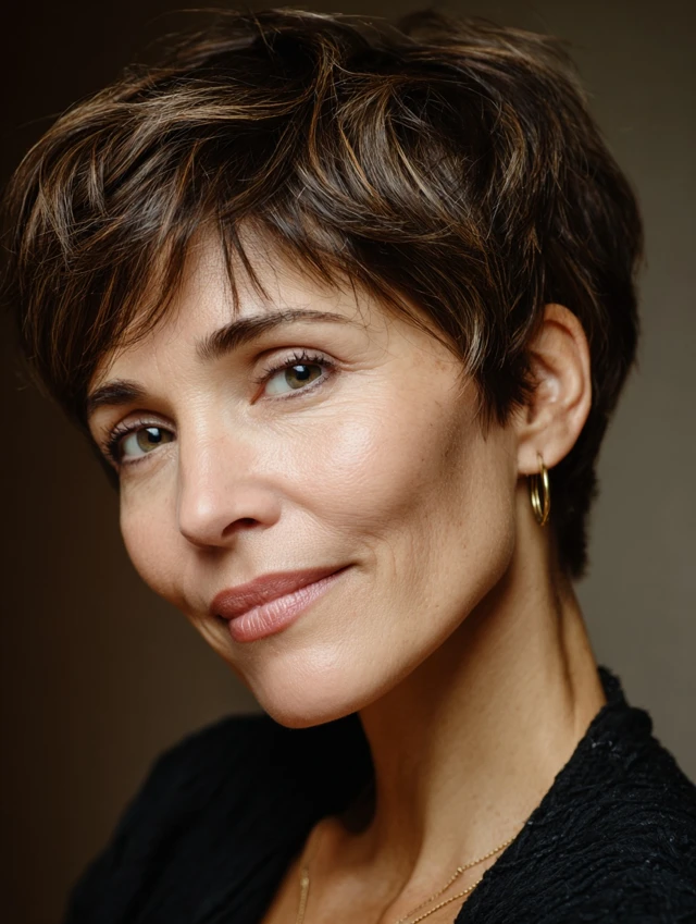 Pixie cuts with bangs remain popular because they add softness and dimension to short hair. The fringe helps frame the face and can subtly adjust proportions.