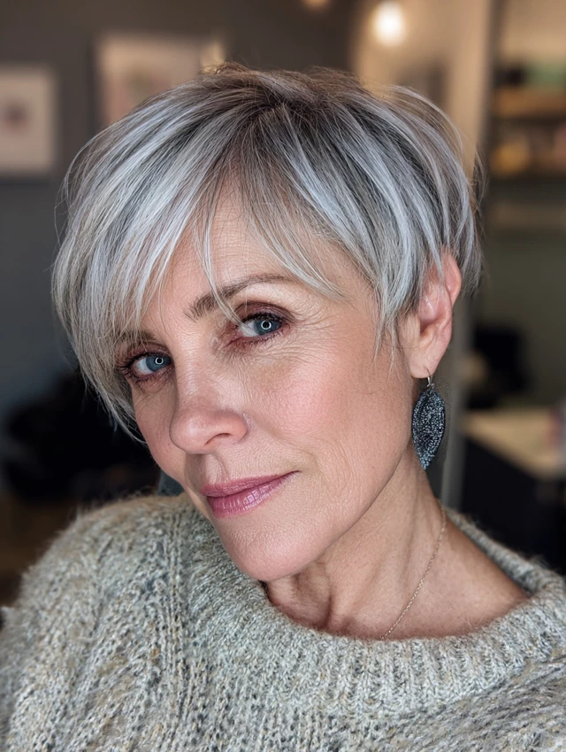 Pixie cuts with bangs for women over 50 combine short, structured shapes with a soft, face-framing element that adds balance and personality. Bangs can soften features, highlight the eyes, and introduce movement, making the overall style feel more dynamic and flattering. When paired with a pixie, they create a modern look that remains easy to manage.