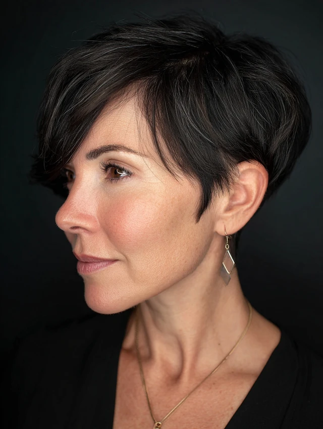 A pixie with long side bangs keeps the fringe extended and angled, creating a dramatic yet soft effect. The longer bangs add versatility.
