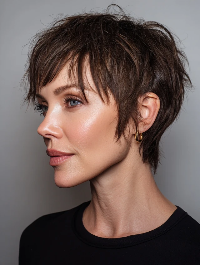 A tousled pixie with bangs embraces natural texture and a slightly messy finish. The bangs add softness to the relaxed look.