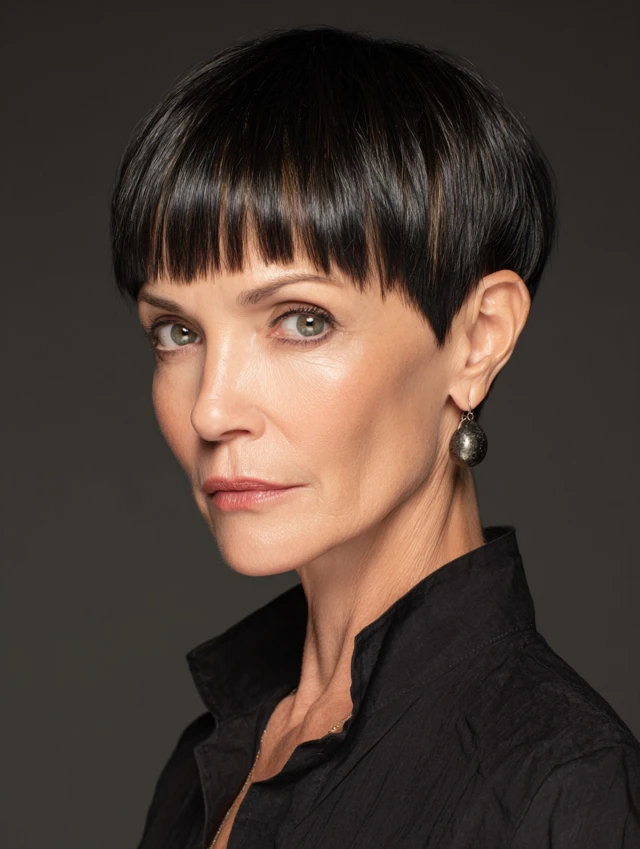 A sleek pixie with straight bangs creates a clean, structured look with a polished finish. The straight fringe adds definition.