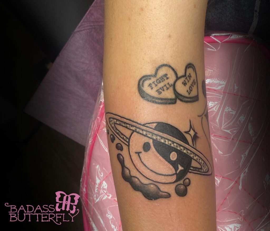 This tattoo merges Saturn’s rings with a yin-yang face that also resembles a smiling planet. Its playful yet symbolic style makes it both meaningful and lighthearted. Beside it, “Fight Evil, Win Love” hearts emphasize positivity and balance.
