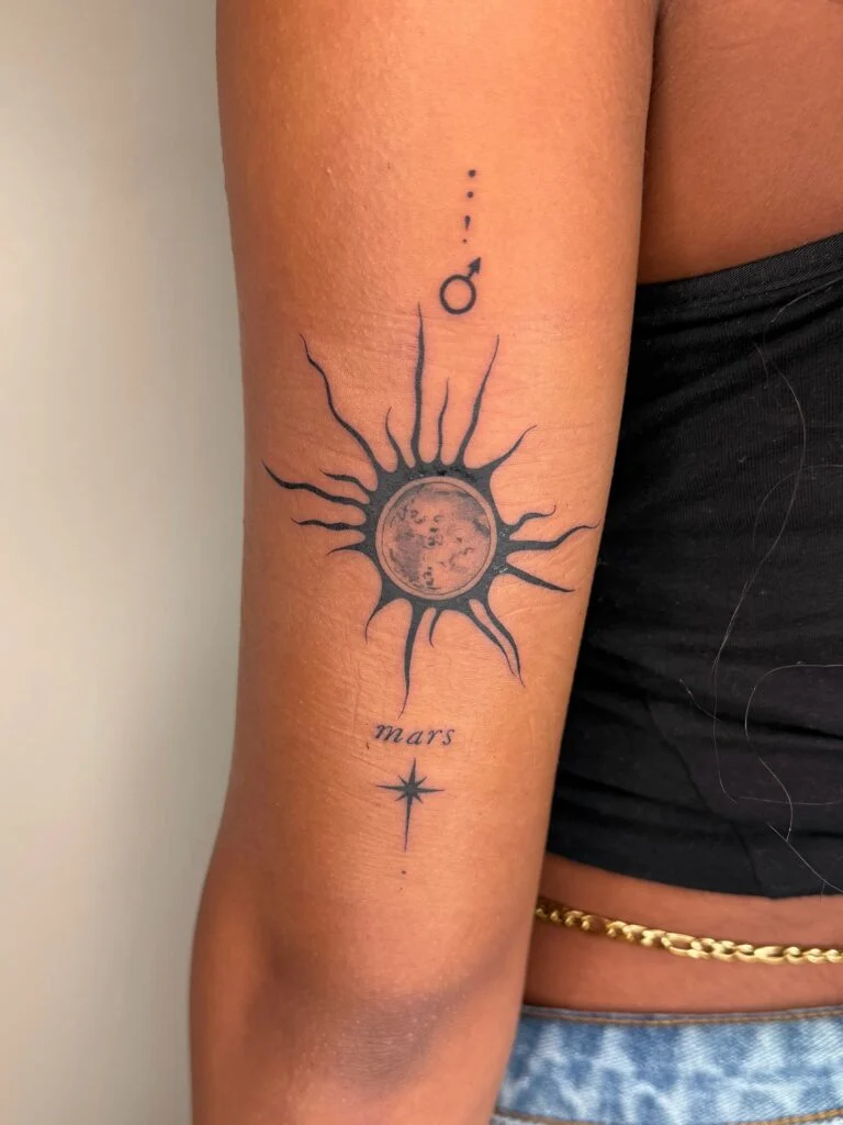 This design merges strength, passion, and cosmic fascination. Mars represents drive, courage, and determination, while the radiant lines give it a sense of fiery power. It’s an inspiring choice for women who want their tattoo to reflect energy, ambition, and connection to celestial forces.