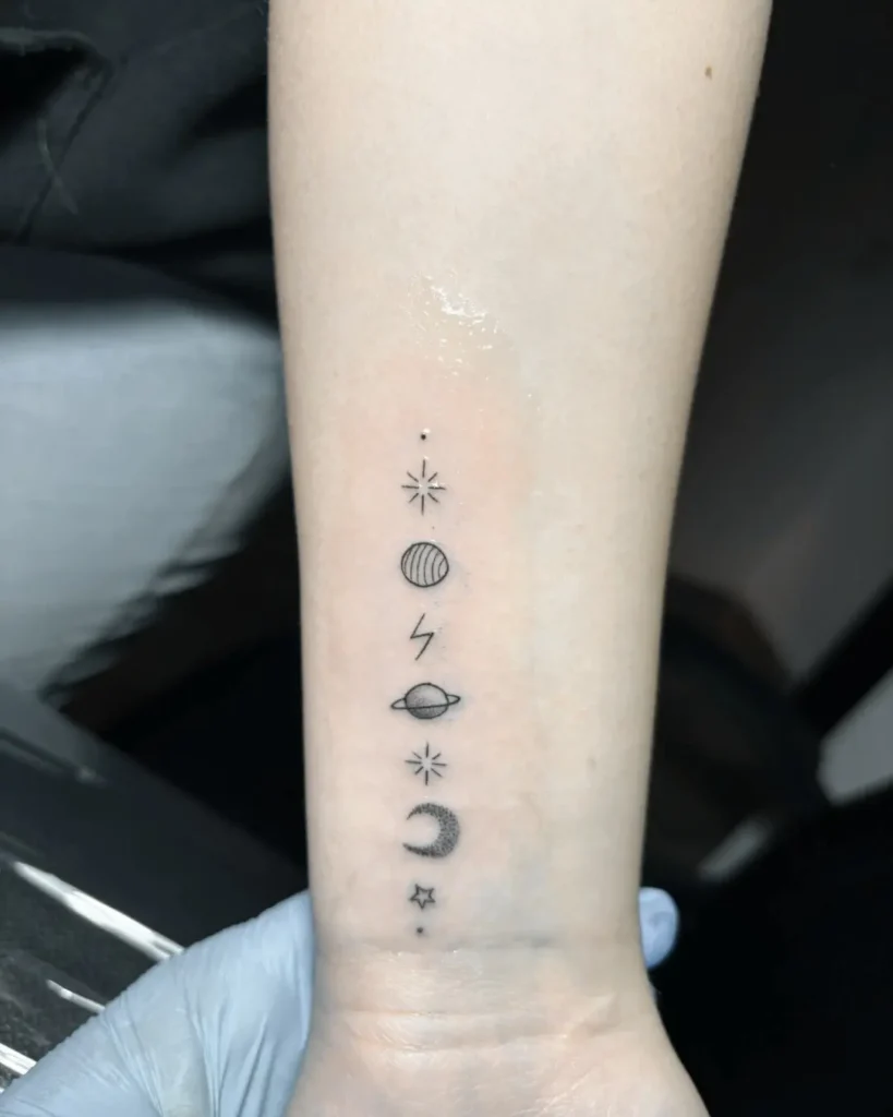 This wrist tattoo uses fine black ink to align planets, stars, a crescent moon, and a lightning bolt in a clean, vertical sequence. Its simplicity gives it a chic, modern edge that feels both stylish and symbolic.