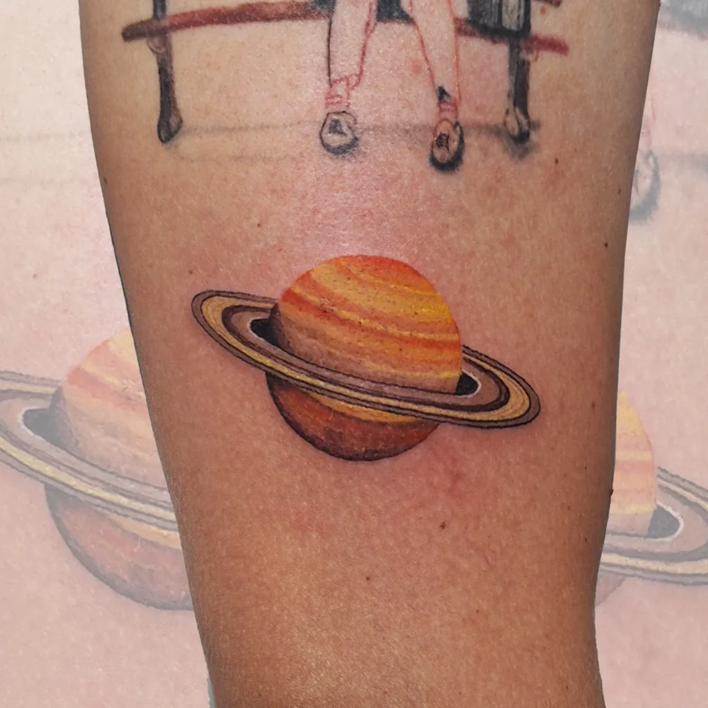 A bold, lifelike portrayal of Saturn, this tattoo captures the planet’s orange and golden hues with remarkable depth. The shading and ring details give it a three-dimensional effect, almost as if Saturn is hovering right on the skin.