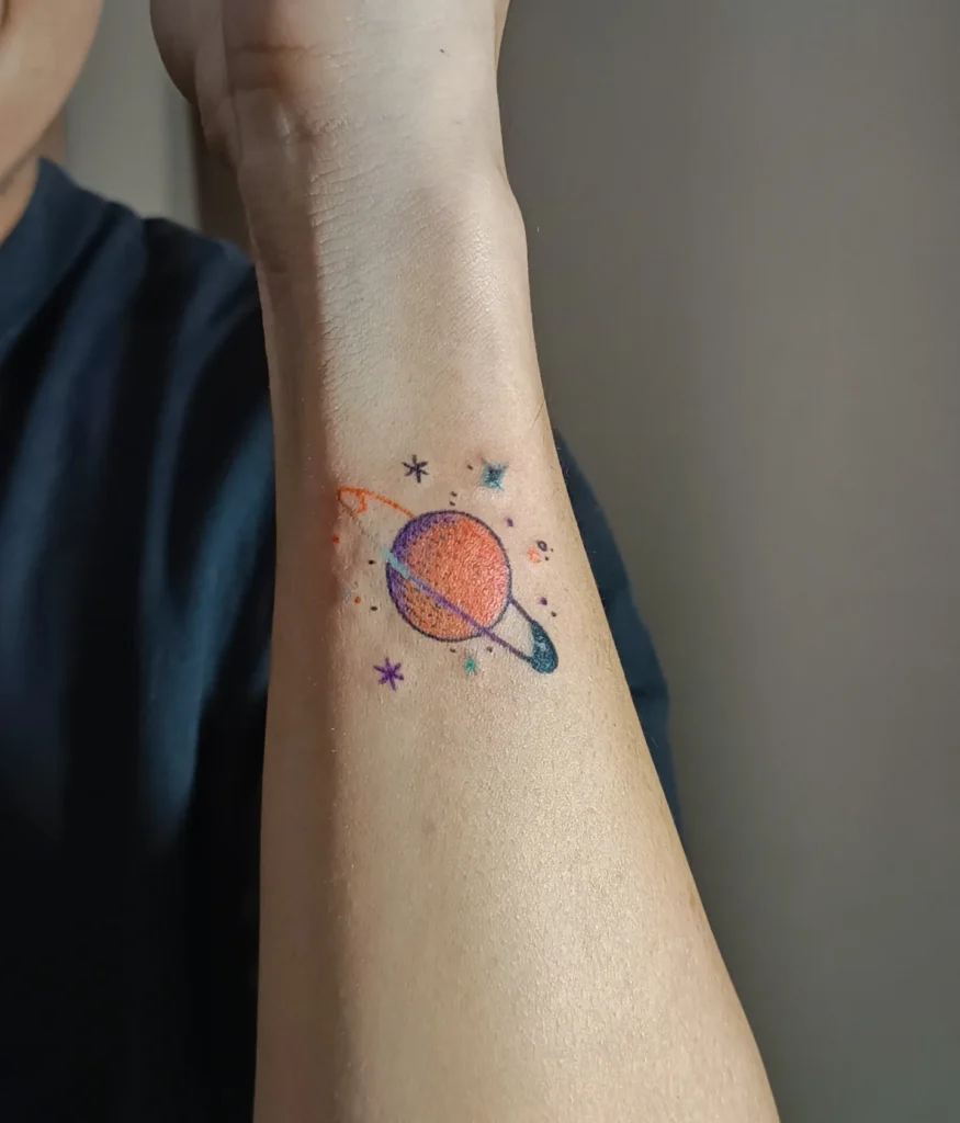 This tattoo portrays Saturn with a radiant orange glow, highlighted by purple and teal shadows, surrounded by stars. The color contrast makes the planet pop, giving it an energetic and youthful vibe on the wrist.
