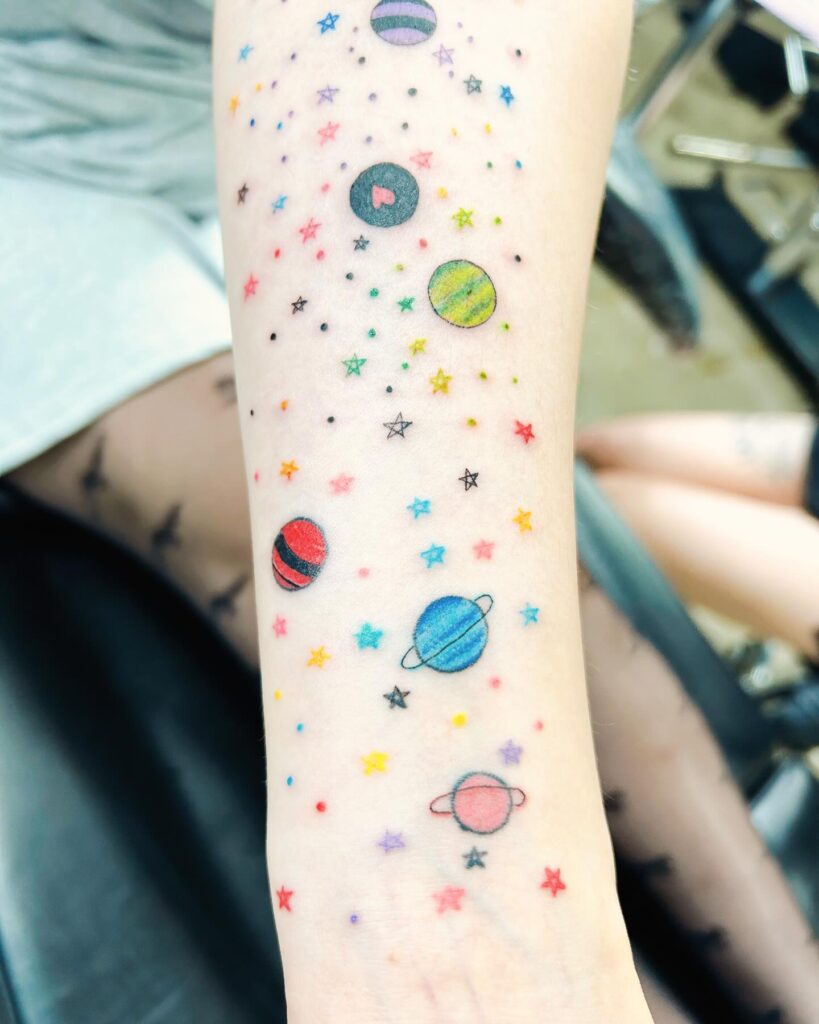 This tattoo bursts with life, featuring a vibrant collection of planets in shades of red, blue, green, and pink, surrounded by multi-colored stars. The playful scatter of celestial bodies across the arm makes it feel like a snapshot of a whimsical universe.