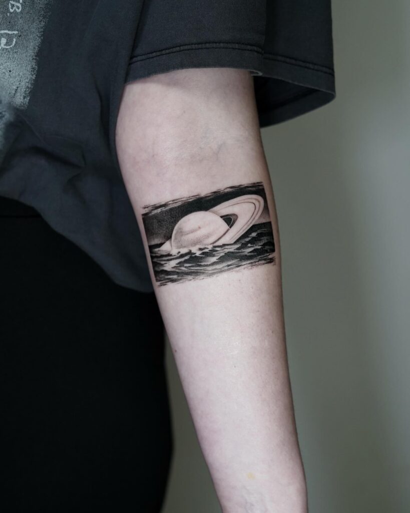 This black-and-grey tattoo shows Saturn hovering above an ocean-like wave scene, framed inside a rectangular shape. The shading creates dramatic contrast, highlighting Saturn’s rings against the moving textures of water.