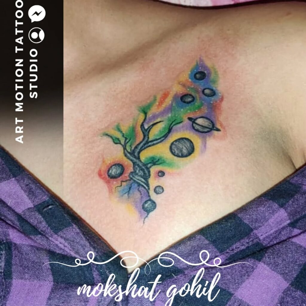 The tattoo brings out an enchanting galaxy vibe, as if capturing a slice of the night sky on skin. The combination of fine black outlines with colorful brush-stroke shading creates a whimsical balance of detail and softness, representing imagination, wonder, and infinite beauty.