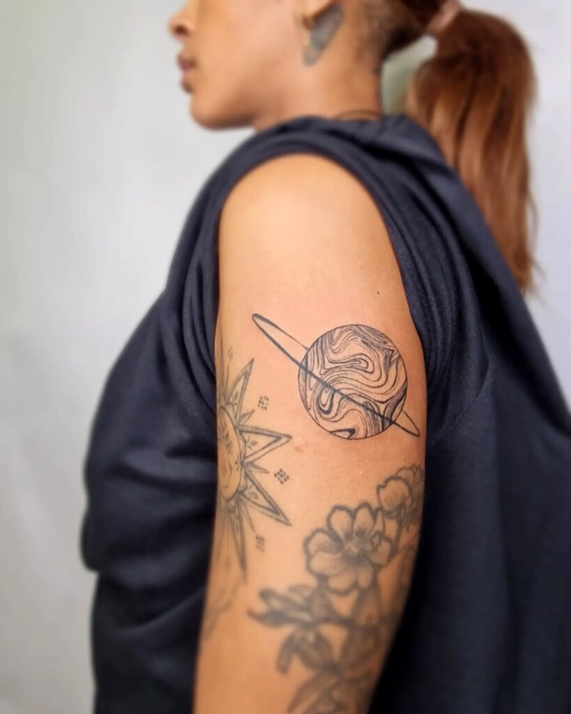 This shoulder tattoo uses fine black lines to render Saturn with swirling marble-like patterns across its surface. Its detailing gives the planet a textured, artistic look, making it feel both abstract and cosmic.