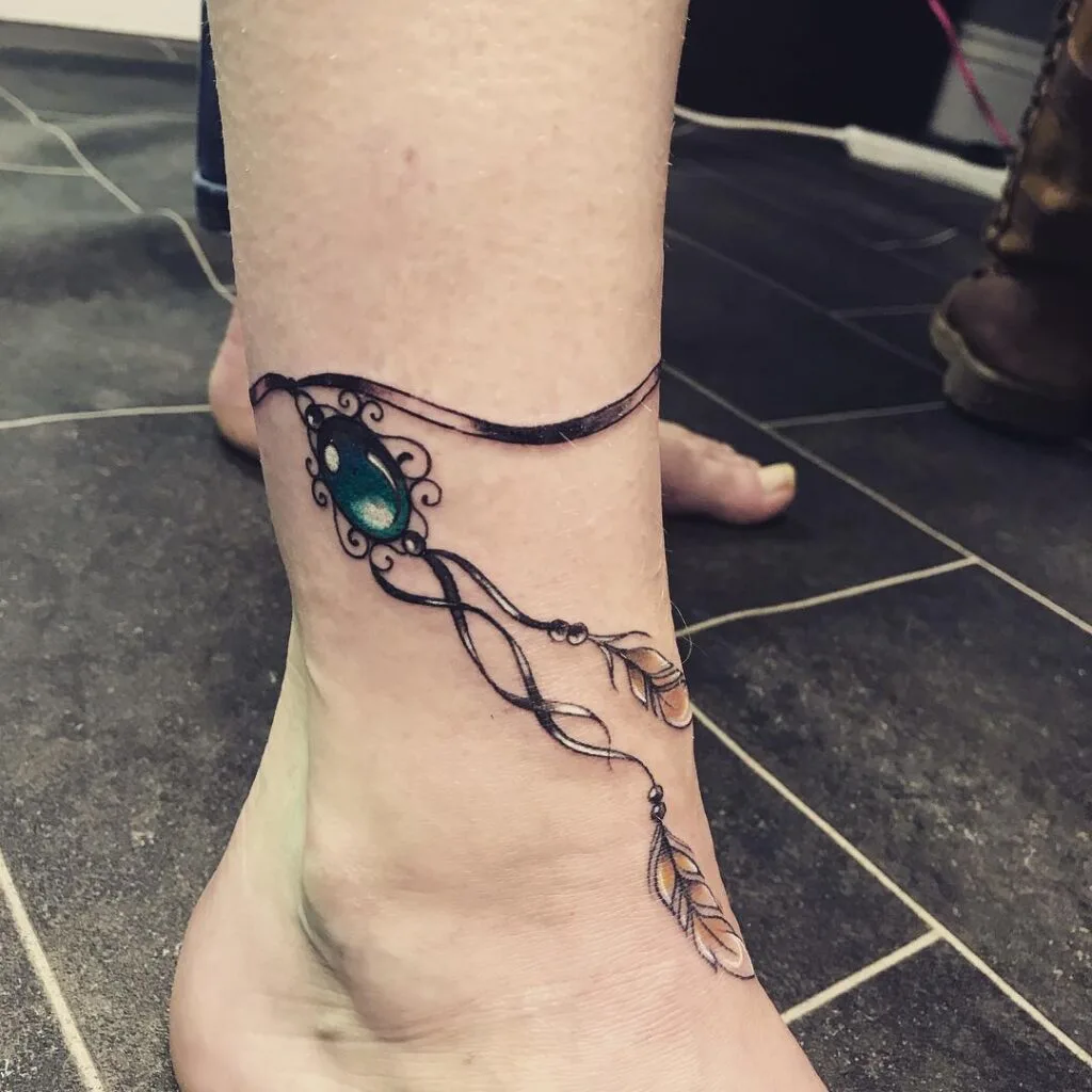 This ankle tattoo mimics the appearance of a delicate anklet, adorned with a central gemstone and intricate feather charms. The shimmering green stone provides a striking focal point, while the feathers add fluidity and a bohemian charm.
