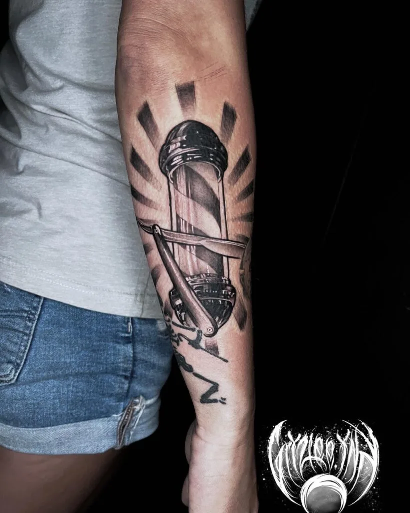 This bold forearm tattoo features a traditional barber’s pole framed by a gleaming straight razor, radiating beams of light. A powerful tribute to craftsmanship and heritage, it symbolizes pride in the barbering profession. The black and grey realism style, paired with sharp shading, gives the design depth and presence.