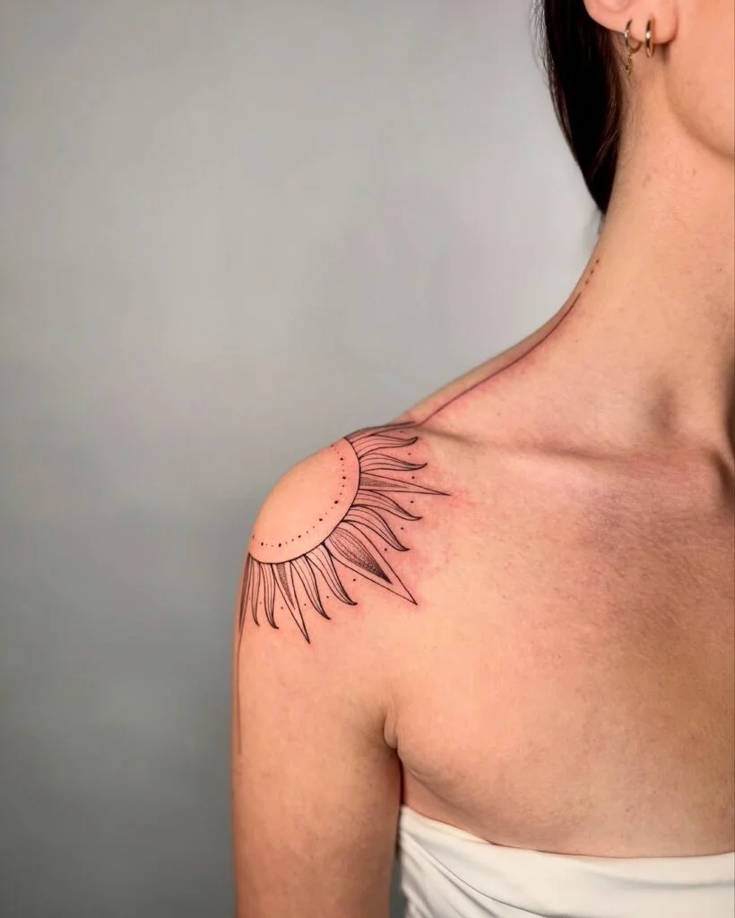 This tattoo features a radiant sun design stretching across the shoulder, blending minimal linework with soft dot details. Its half-sun motif creates a harmonious balance between boldness and delicacy, symbolizing warmth, life, and energy. Positioned across the shoulder and collarbone, it enhances natural contours, making it both eye-catching and elegant.
