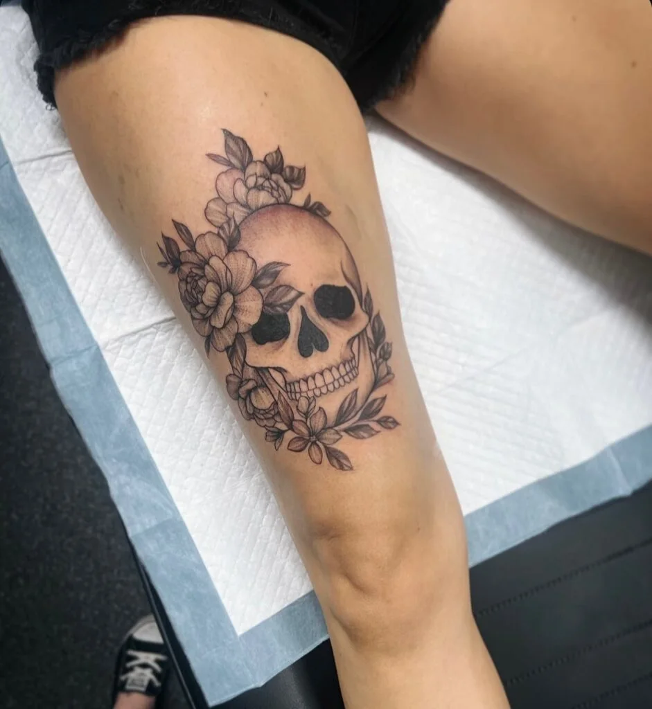 This bold thigh tattoo merges the imagery of a skull with surrounding blossoms, creating a striking contrast between mortality and beauty. The skull symbolizes strength, transformation, and the acceptance of life’s impermanence, while the flowers soften the composition with femininity, growth, and renewal.