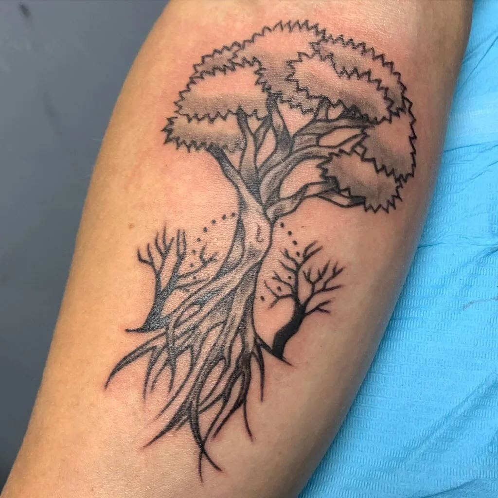 This tattoo features a tall, leafy tree with roots flowing downward and smaller trees branching from its base. The detailed shading and flowing roots suggest cycles of life, rebirth, and resilience that carry forward through time.