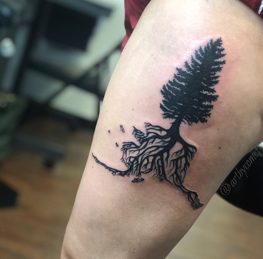 This tattoo depicts a tall pine tree with roots exposed, as if lifted from the earth. The roots stretch in sharp, detailed lines, suggesting strength even when detached from the ground. The bold black ink gives it a raw, powerful energy.