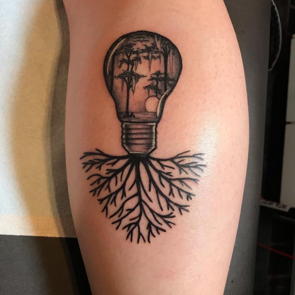 This tattoo depicts a lightbulb containing a tranquil forest scene, complete with tall trees and a glowing horizon. From the bulb’s base, intricate roots spread outward, connecting creativity with the natural world. The fine shading inside the bulb contrasts beautifully with the sharp, detailed rootwork.