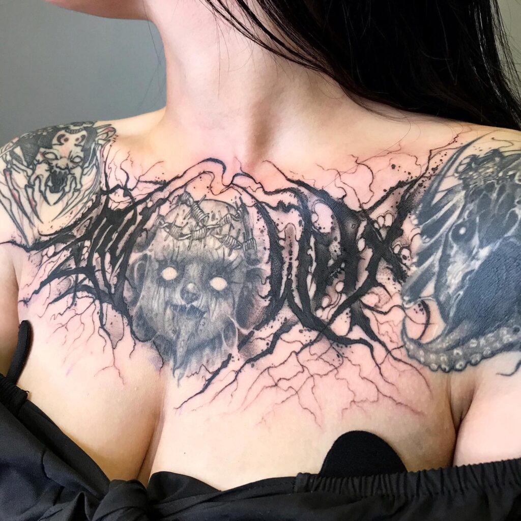 This chest tattoo spreads across the collarbones with branching roots woven around eerie, shaded faces and dark imagery. The use of deep black ink and unsettling motifs creates an intense, gothic aesthetic.