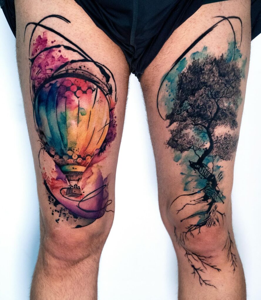This vivid tattoo combines a watercolor hot air balloon on one thigh with a dark rooted tree on the other. The balloon is painted in bold, vibrant colors, while the tree flows in black ink with watercolor splashes of teal and blue. Together, they create a stunning contrast of flight and grounding.