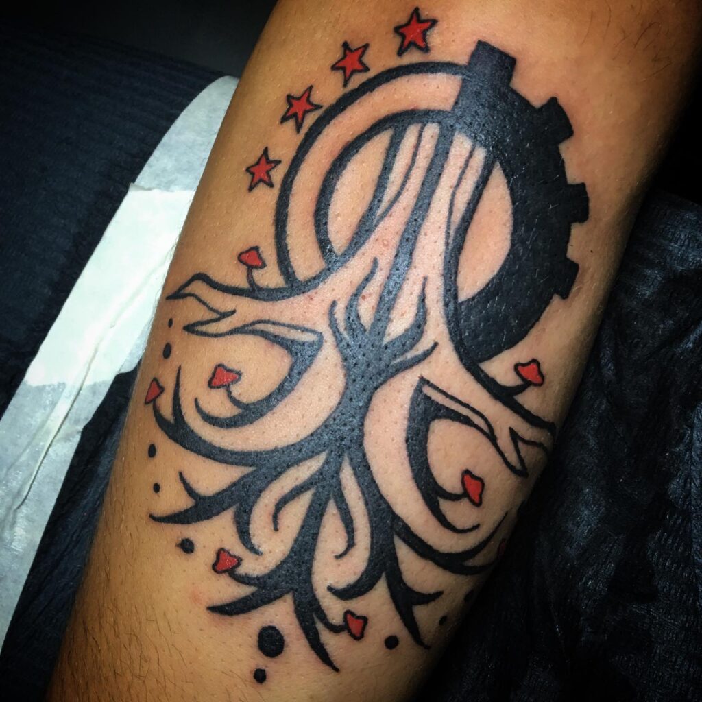 This tattoo combines bold black lines and gears with branching roots to symbolize strength, power, and movement. Red stars and accents add a vibrant contrast, giving it an industrial yet organic style. The thick outlines and bold curves make the design visually striking and powerful.