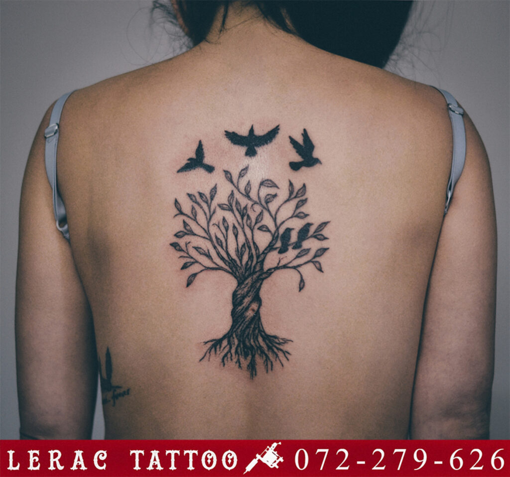 This tattoo shows a strong tree with detailed roots and a canopy filled with leaves, placed elegantly on the back. Above the branches, birds take flight, representing freedom and release. The flow of the design emphasizes grace and movement across the upper back.