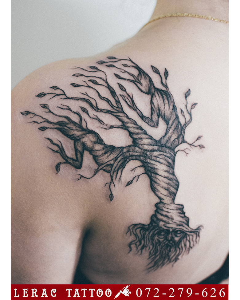 This tattoo on the back shoulder displays an inverted tree, with twisted branches reaching upward and roots forming a mysterious face. The detailed bark texture and flowing branches create a surreal yet powerful effect, blending natural and mystical symbolism.