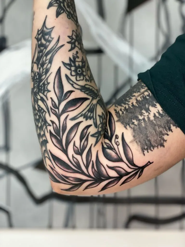 This tattoo merges leafy vines and floral patterns with a dark forest silhouette. The leaves curve naturally around the arm, while the tree line adds depth and contrast, layering two natural worlds into one flowing piece.