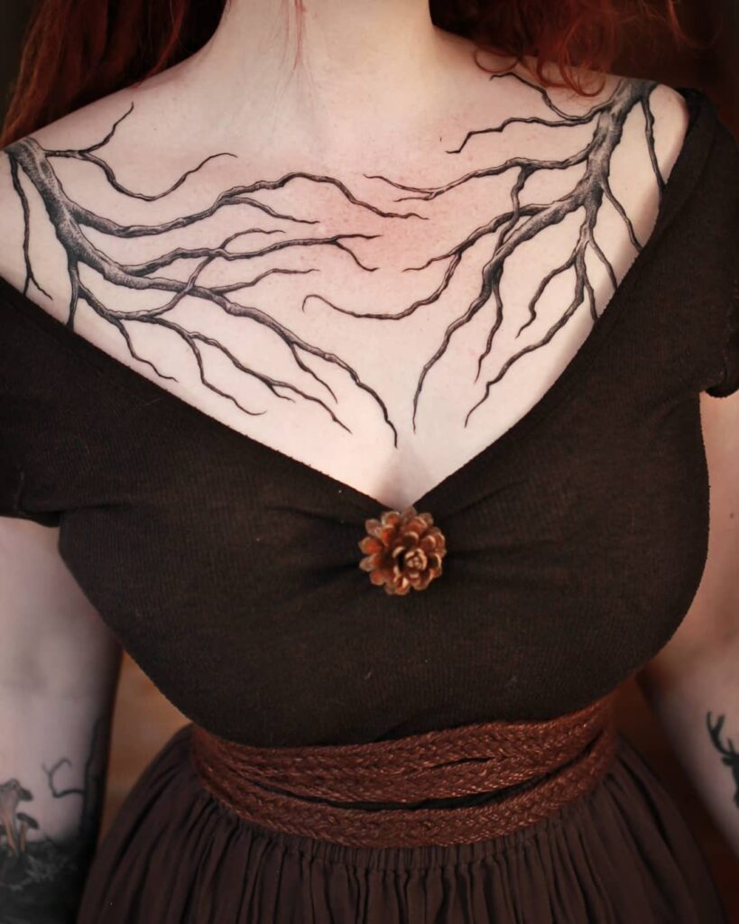 This chest tattoo stretches across the collarbone, resembling roots or branches extending outward. The delicate shading mimics the natural spread of tree limbs, enhancing the neckline like an organic necklace.