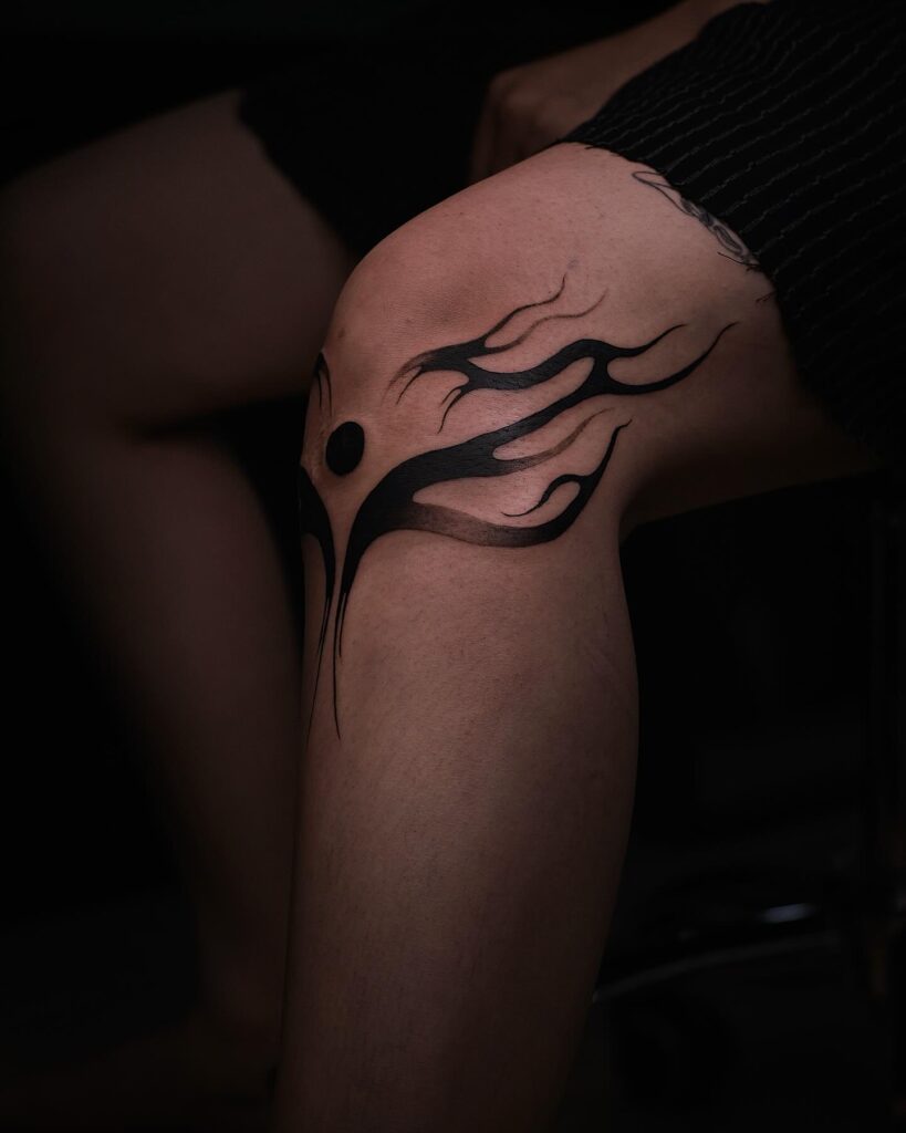 This striking blackwork tattoo extends around the knee, with flame-like root branches stretching outward from a central black circle. The bold lines create a sense of movement and power, resembling fire, roots, or energy flowing through the body.