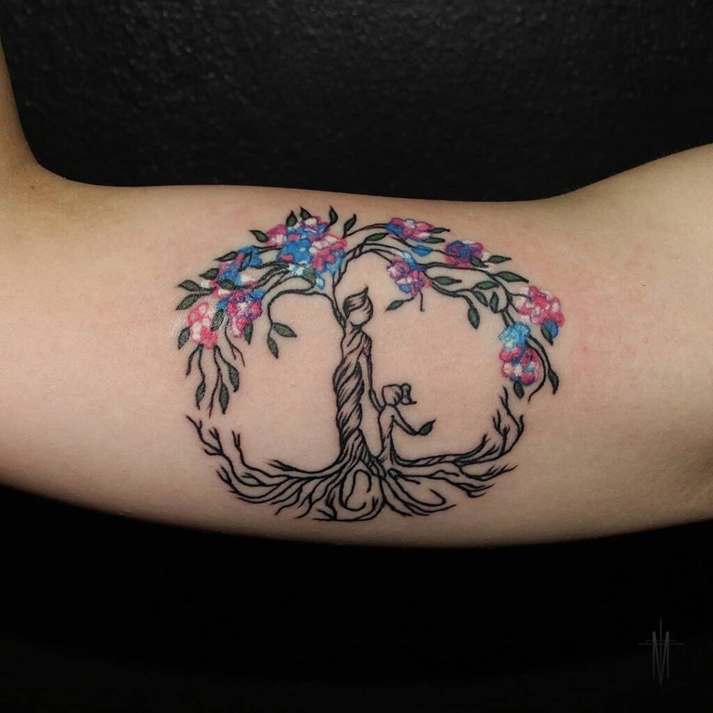 This tattoo shows a circular tree with roots forming a sturdy base and branches decorated with colorful pink and blue blossoms. At its core, the trunk subtly outlines a parent and child, symbolizing nurturing, connection, and love that blossoms through generations.