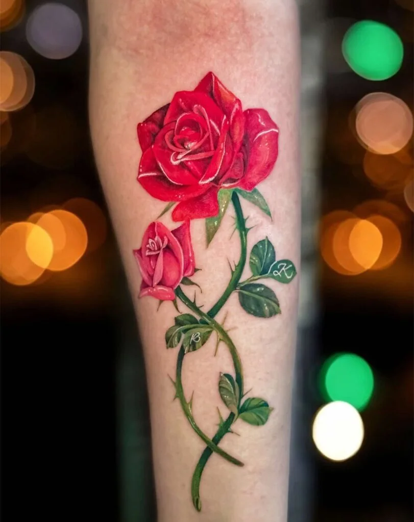 This stunning forearm tattoo uses fine shading to achieve a highly realistic look. The petals are detailed with smooth gradients, giving the rose a three-dimensional effect that looks almost lifelike.