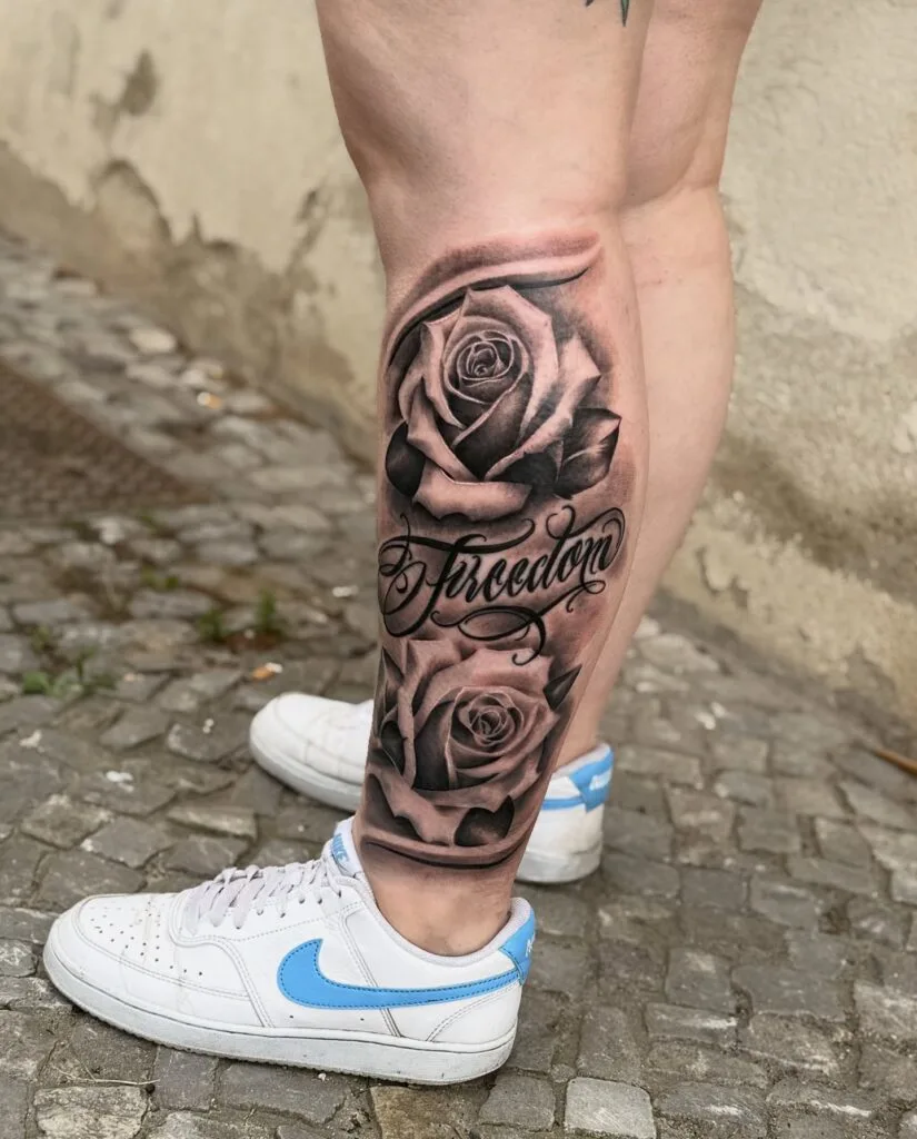 This leg tattoo blends stunning black-and-grey realism with elegant script lettering. The rose is shaded to look three-dimensional, with velvety petals and a soft gradient background that gives it depth. The word “Freedom” flows naturally above it, tying the piece together.