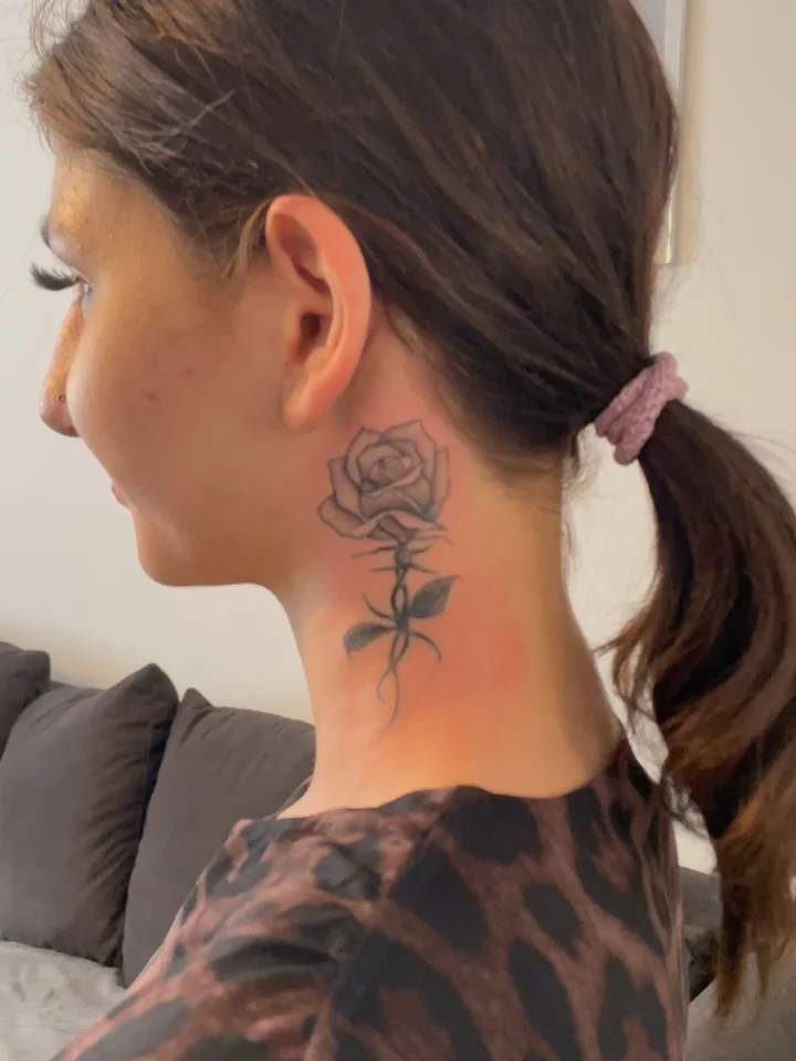 This behind-the-ear tattoo features a finely detailed rose, with its stem curving gently down the neck. The placement makes it both intimate and eye-catching, perfect for those who want a design that can be hidden with hair or displayed as a bold statement.